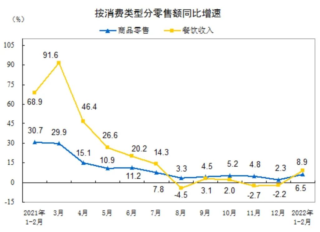2 按零售业态分,1-2月份限额以上零售业单位中的超市、便利店、百货店、专业店和专卖店零售额同比分别增长3.0%、12.8%、2.1%、10.3%和5.3%。增速比2021年两年平均增速均有所加快。
