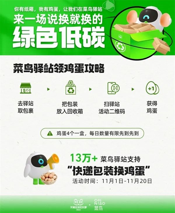 绿色物流方面,菜鸟去年双11期间曾因接地气的“快递包装换蛋”绿色物流活动引发热议,今年的“云监工”,将在华东的一家24小时菜鸟驿站外,超11天连续慢直播,见证菜鸟和居民们如何亲身践行一场绿色双11。
