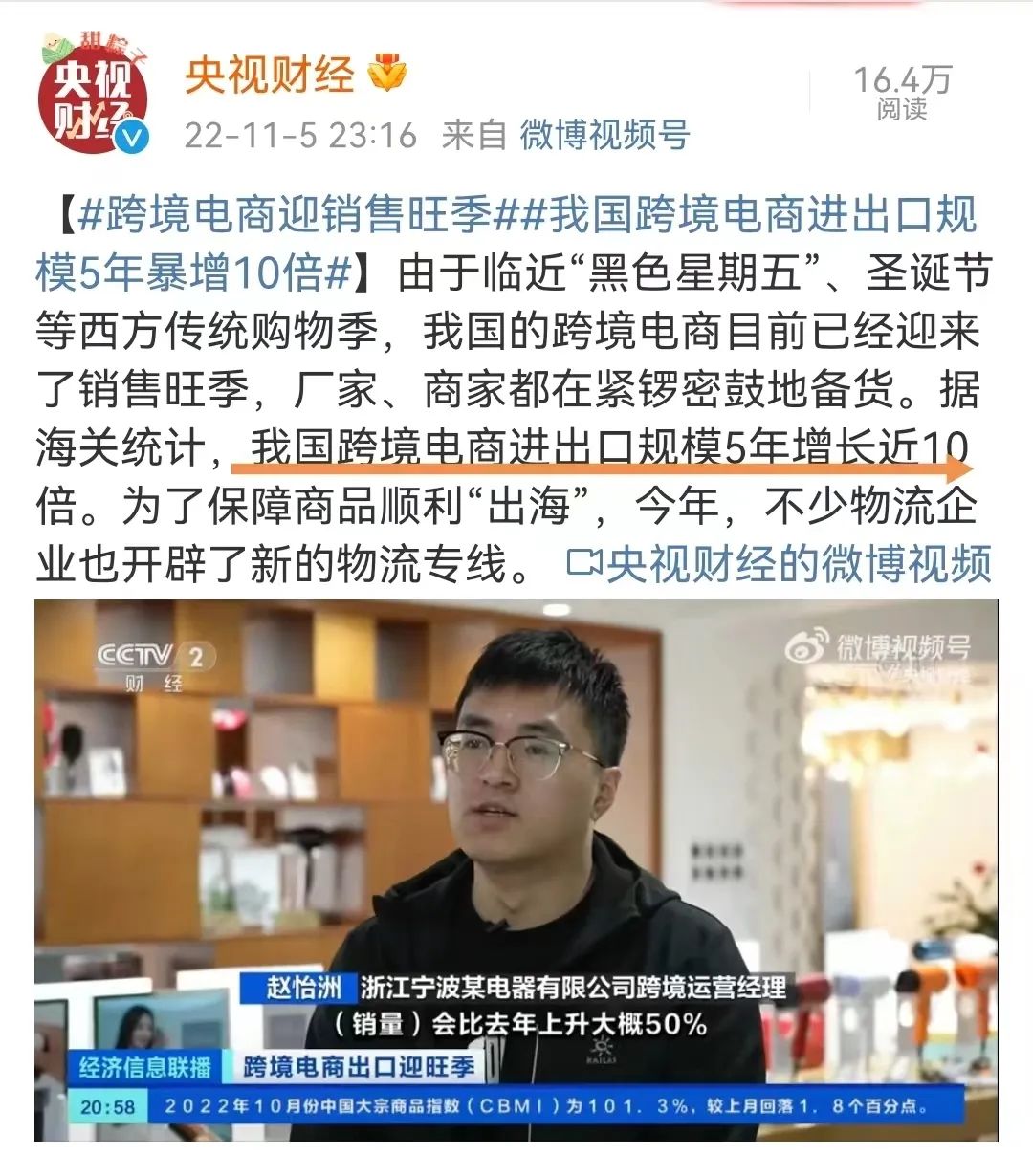 11月6日消息,央视财经报道,海关数据显示,我国跨境电商进出口规模5年增长近10倍。