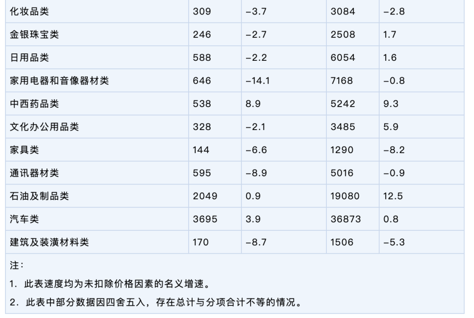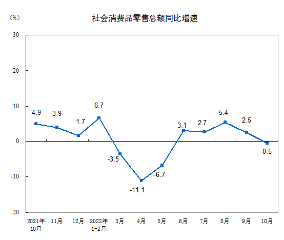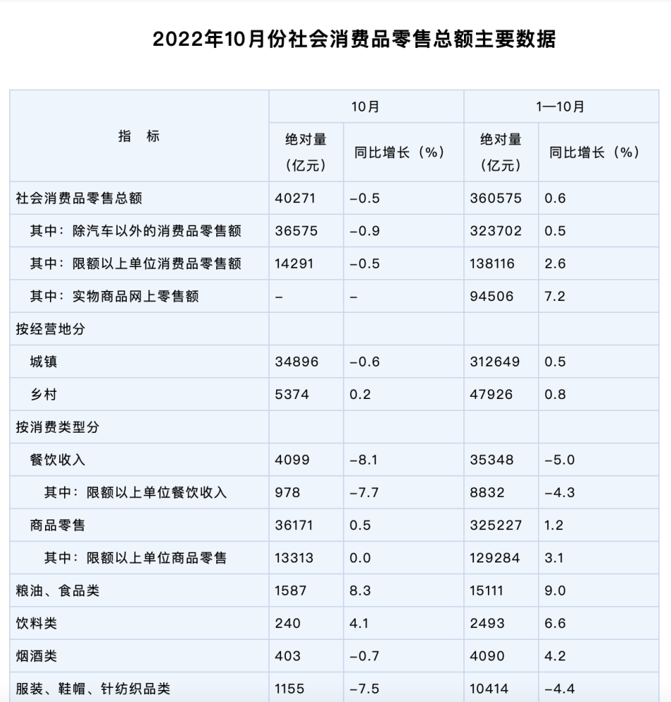 10月份,社会消费品零售总额40271亿元,同比下降0.5%。其中,除汽车以外的消费品零售额36575亿元,下降0.9%。