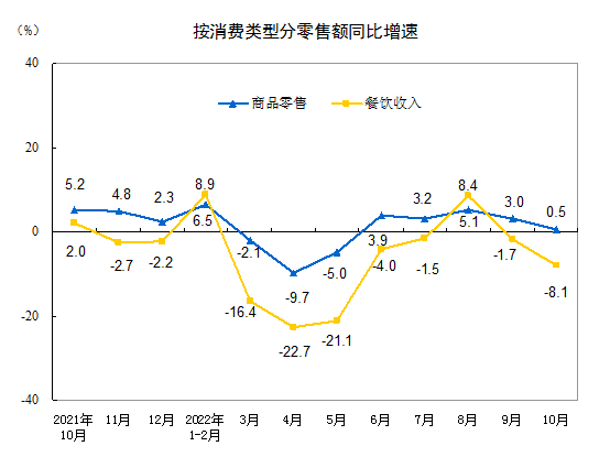 按消费类型分,10月份,商品零售36171亿元,同比增长0.5%;餐饮收入4099亿元,下降8.1%。1-10月份,商品零售325227亿元,同比增长1.2%;餐饮收入35348亿元,下降5%。