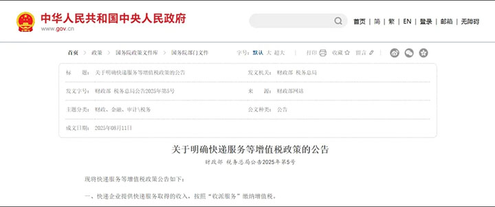 8月12日,财政部、国家税务总局公布《关于明确快递服务等增值税政策的公告》,公告明确,快递企业提供快递服务取得的收入,按照“收派服务”缴纳增值税。
