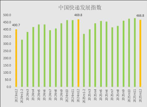 12月,发展趋势指数为61.7。12月,快递业在畅通经济循环、服务扩大内需、增进民生福祉等方面的作用愈发凸显。2026年,在提振消费专项行动的有力推进下,行业将继续保持稳中有进良好态势,推动实现质的有效提升和量的合理增长。