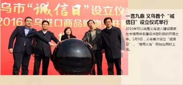 去年1月9日,义乌市首个“诚信日”设立仪式在义乌国际商贸城五区市场南大门举行。仪式上,“信用义乌”网站正式上线。该网站集合了包括义乌市公安局、财政(地税)局、市场监管局、海关、国税局在内的39个部门,涉及37万个商事主体,320多万条数据,信息纬度包括基本信息、失信信息、良好信息和重点行为信息等,可查询企业和商位信用、失信“黑名单”和贸易预警等,致力于打造一个多维度、全覆盖的主体信用公示体系。