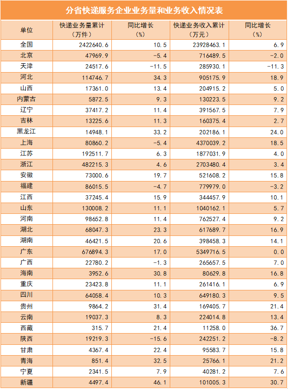 一季度,全国快递服务企业业务量累计完成242.3亿件,同比增长10.5%;业务收入累计完成2392.8亿元,同比增长6.9%。其中,同城业务量累计完成29.2亿件,同比增长5.6%;异地业务量累计完成208.8亿件,同比增长12.0%;国际/港澳台业务量累计完成4.3亿件,同比下降19.1%。