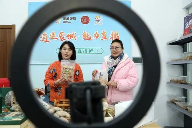 安徽省蒙城县王集乡农村电商服务中心,当地农产品加工企业工作人员与来自县城的电商主播一起在直播间推介自己生产加工的特产及农副产品。
