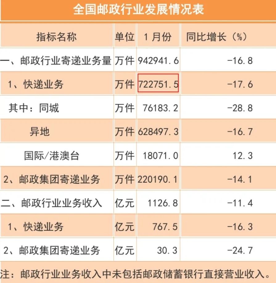 媒体报道国家邮政局:2023年1月快递业务量完成72.3亿件