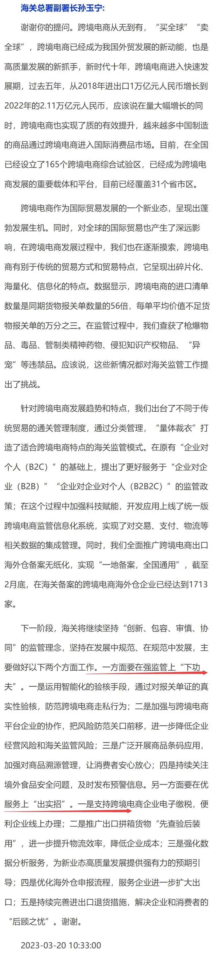 第二,在优服务方面,支持跨境电商企业电子缴税,便利企业线上办理;推广出口拼箱货物“先查验后装用”,进一步提升物流效率,降低企业成本;强化数据分析服务,为新业态高质量发展提供强有力的预期引导;优化海外仓申报流程,服务企业进一步扩大出口;持续完善进出口退货措施。
